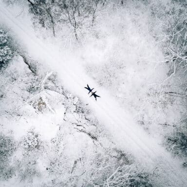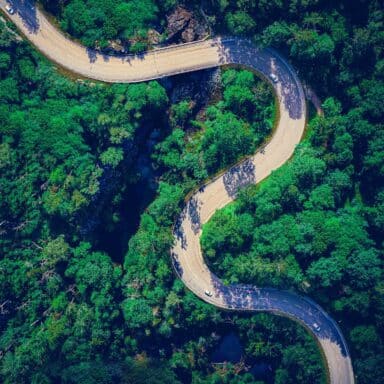 Den ensamma vägen är ett perfekt motiv för din drönaren. Fotografera ovanifrån med kameran riktad rakt ner. Välj en väg med en omgivning som inte är för rörig, till exempel endast träd eller gräs.