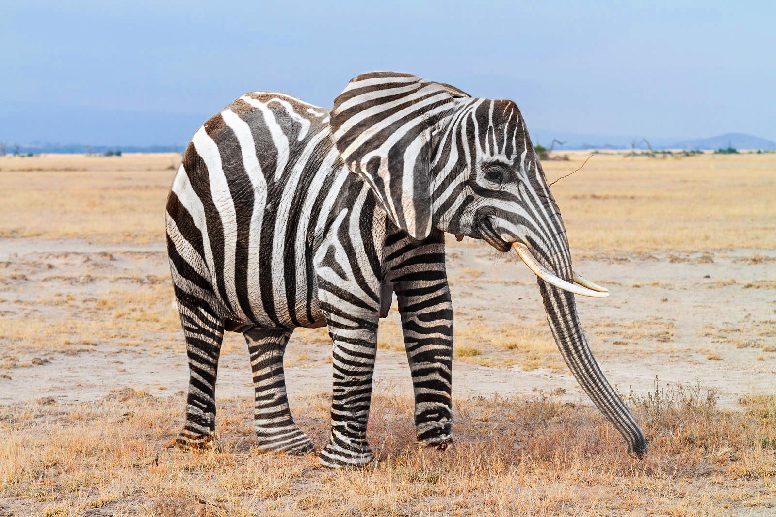 Den här zebran delas upp i olika delar för att passa elefantens form. Med filtret Gör flytande och verktyget Smeta framåt kan du puffa runt formen på ditt motiv för att matcha den önskade formen.