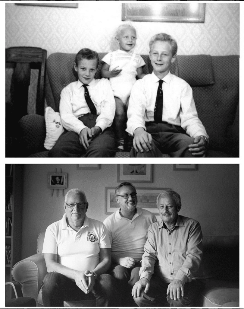 Bilden nedan kommer från Anders Lönnquist. Han samlade ihop sina bröder och återskapade en bild som deras farfar plåtade med sin bälgkamera runt 1960. Samma kamera användes 55 år senare!