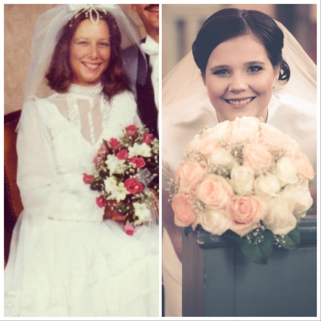 Jag valde en bild från min mammas bröllopsdag och en på mig från min egen. Bilderna är egentligen inte så lika, men jag kan ändå tycka att vi har lite liknande leenden.