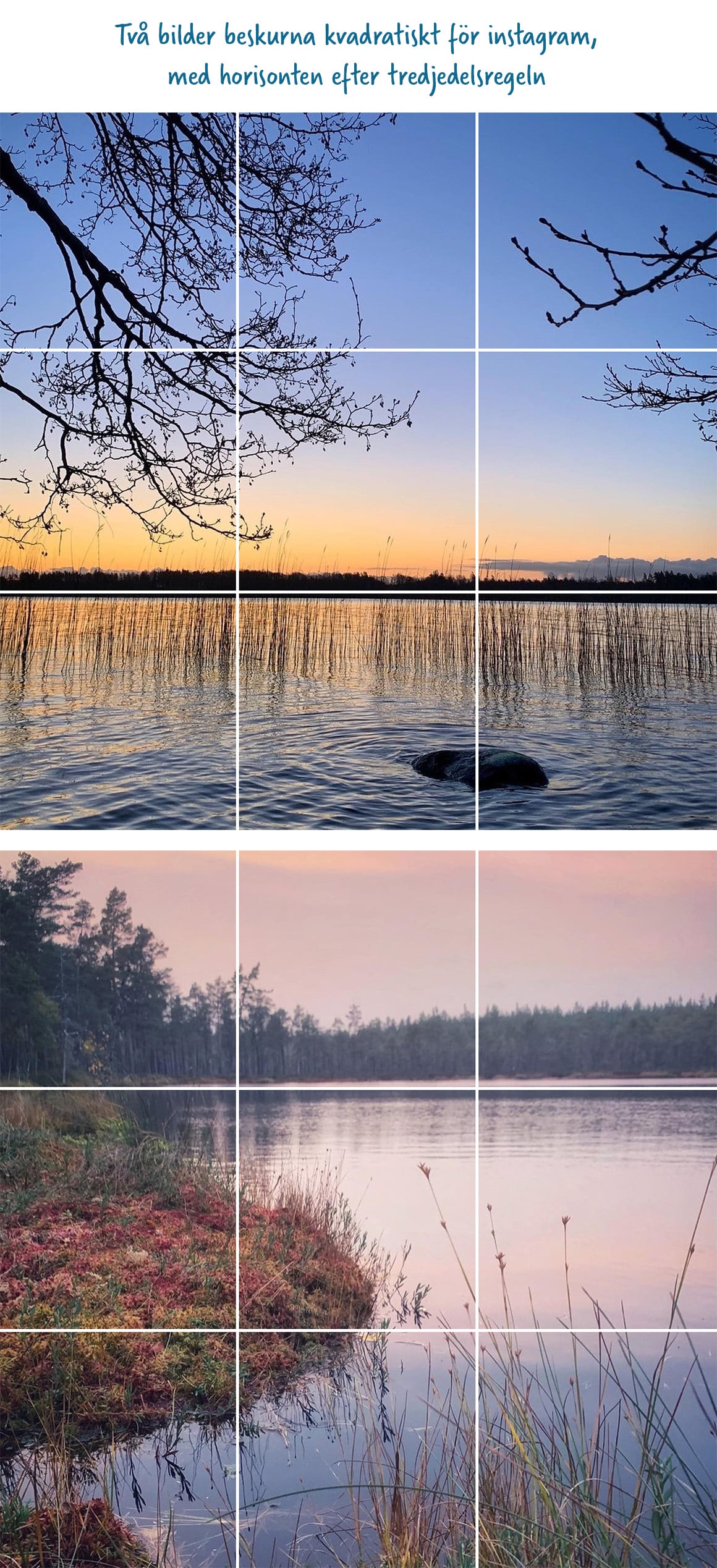 Landskapsbilder passar utmärkt som start när du ska lära dig tredjedelsregeln. De är ju fyllda av raka linjer, som exempelvis horisonter och träd. Många märker direkt vilken skillnad det blir i bilderna när horisonten inte placeras rakt i mitten.
