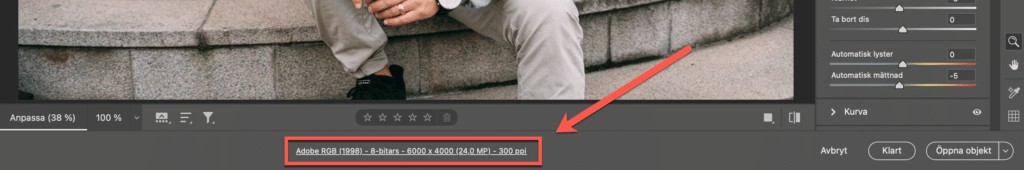 Du kan ställa om så att dina bilder öppnas med 16 bitars färgdjup. På så sätt tål bilderna mer bildbehandling inuti Photoshop. För att kunna spara som JPEG från Photoshop, när du är klar, krävs det att du ställer tillbaka färgdjupet via Bild > Läge > 8 bitar/kanal.