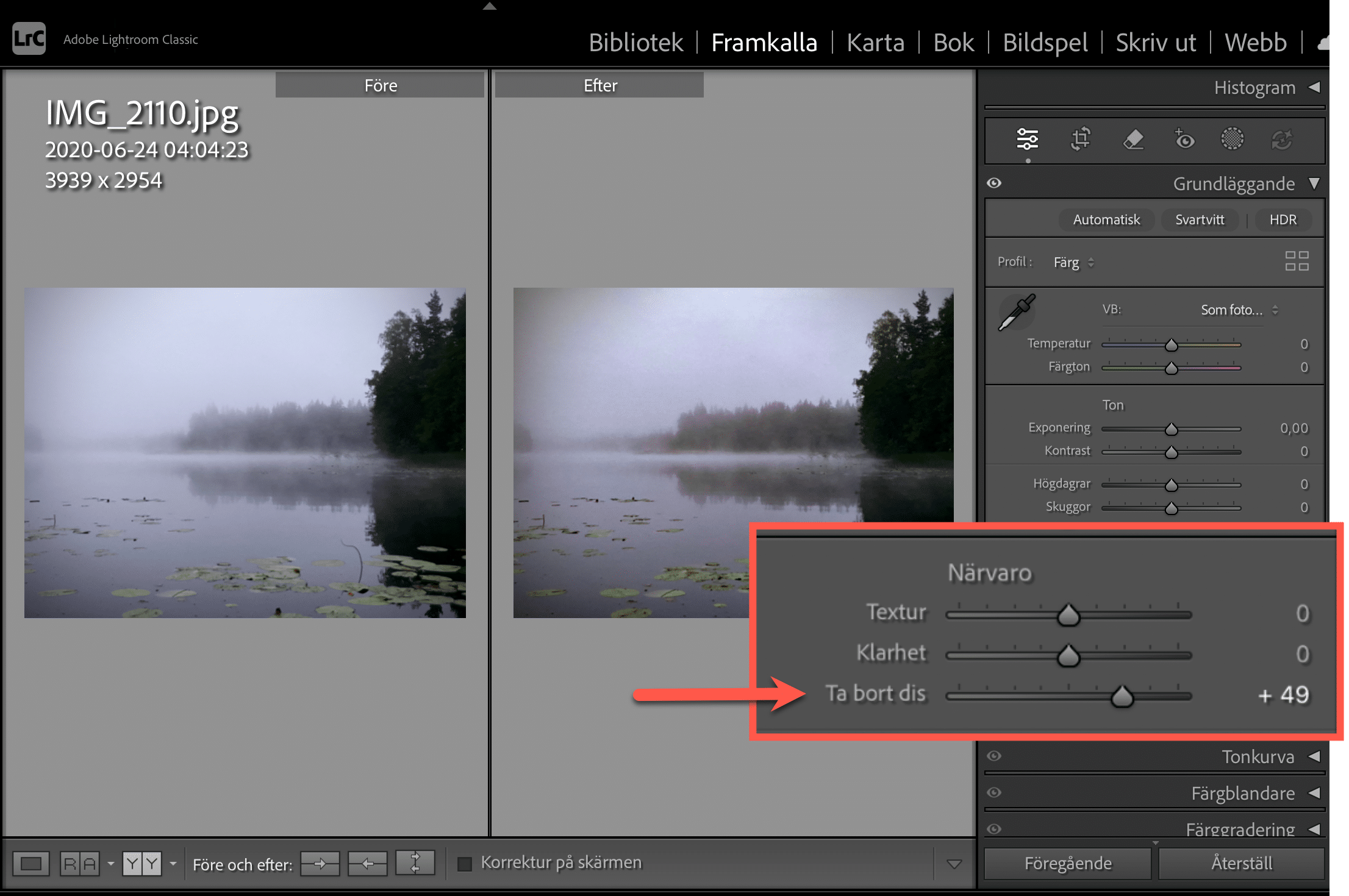 Ibland kommer du att få precis de färgerna du vill ha men kanske lite för aggressiv konstrast. Kom då ihåg att du också kan minska kontrasten med andra reglage under panelen Grundläggande, istället för att backa tillbaka mängdreglaget för Ta bort dis.