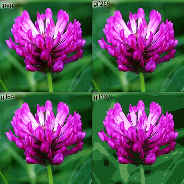 Originalet i JPEG med maximal kvalitet överst till vänster. GIF med 256 färgers palett uppe till höger. I nedre raden finns samma foto med allt mindre palett. Vad GIF gör blir riktigt tydligt i sista fotot.
