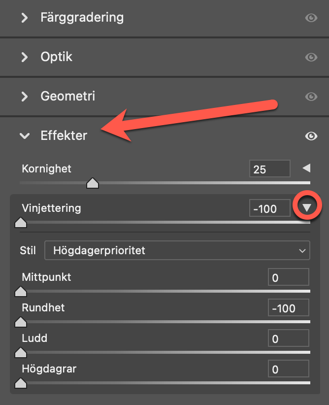 Under fliken Effekter hittar du Vinjett efter beskärning. Har du CS4 ligger den under Linskorrigeringar. Genom att använda denna funktion kan du enkelt skapa en vinjetteringseffekt som ger dig runda hörn på ditt foto.