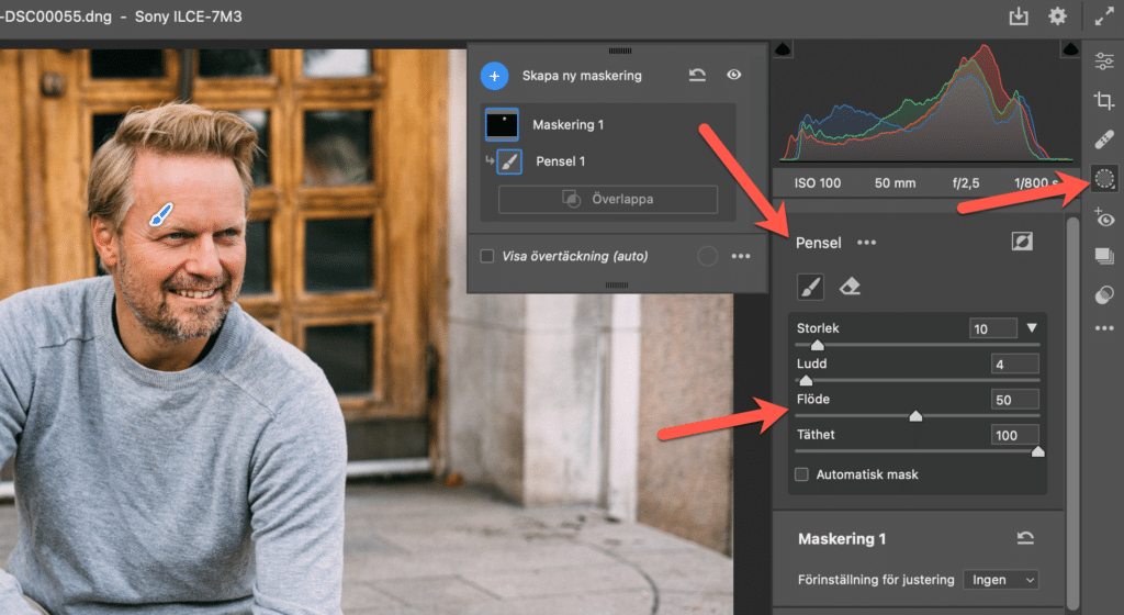 Skapa en maskering med penseln i maskeringsverktyget. Sätt Flöde på penseln till 50, vilket gör att du kan bygga upp din justering i bilden genom att måla flera gånger. Sänk också Klarhet till ett värde på -40.