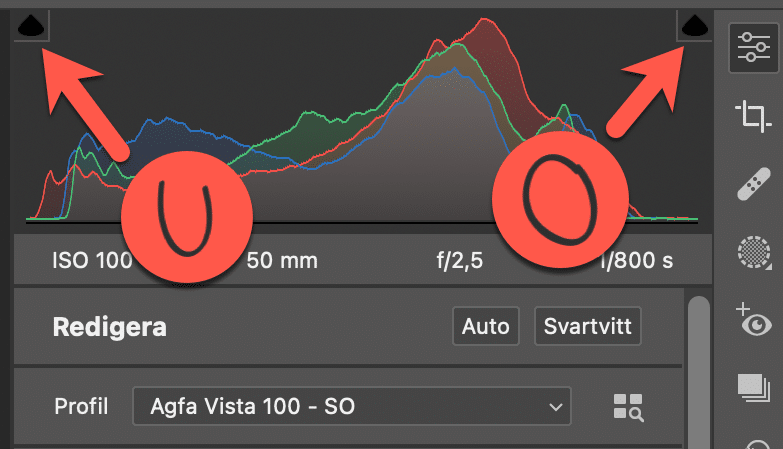 Genom att klicka uppe i hörnen på histogrammet i Camera Raw kan man slå av och på markering för under- respektive överexponering.