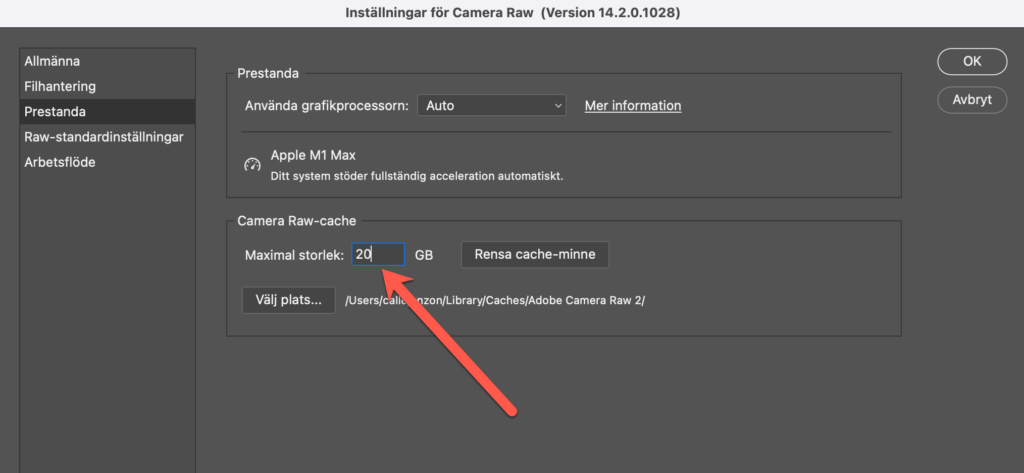 Så varför talar jag om detta? Jo, det är så att cache-mappen är storleksbegränsad till 1 GB. Det innebär att uträkningarna för ca 200 bilder lagras. Sen skriver Camera Raw över de gamla bilderna med bilder du nu arbetar med.