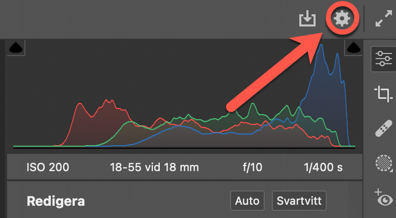 För att komma till inställningarna i Camera Raw finns en fin knapp i verktygsfältet inne i Camera Raw. Du kan också trycka Cmd + K (PC: Ctrl + K)